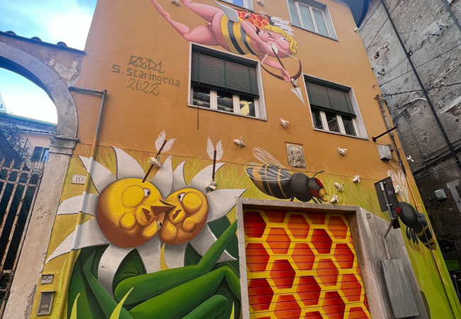 L’intervento scultoreo di Silvia Scaringella rende la superficie murale plastica e chiaroscurale, dando maggiore suggestione, giocando a materializzare la pittura: “Rievocando le facciate decorative ornamentali del passato, le api sono spesso usate a ornamento nelle architetture romane, simbolo di un identità urbana fatta di comunità conviventi”, evidenzia l’artista nella nota stampa.