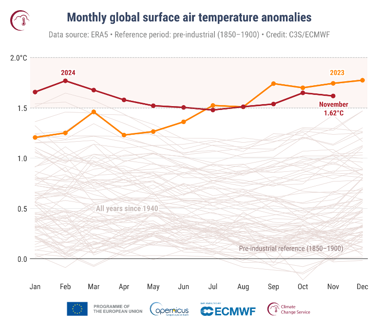 l Servizio per il Cambiamento Climatico di Copernicus (C3S) ha pubblicato i dati relativi al novembre 2024, evidenziando anomalie significative nella temperatura globale. La maggior parte dei risultati riportati si basa sul set di dati della rianalisi ERA5, che utilizza miliardi di misurazioni provenienti da satelliti, navi, aerei e stazioni meteorologiche di tutto il mondo. Secondo il rapporto, il mese di novembre 2024 è stato il secondo più caldo mai registrato, con una temperatura media dell’aria di 14,10°C, superando di 0,73°C la media del periodo 1991-2020. Questo dato pone il 2024 sulla strada per diventare l’anno più caldo mai registrato, con una temperatura media globale già superiore di 1,62°C rispetto ai livelli preindustriali.
