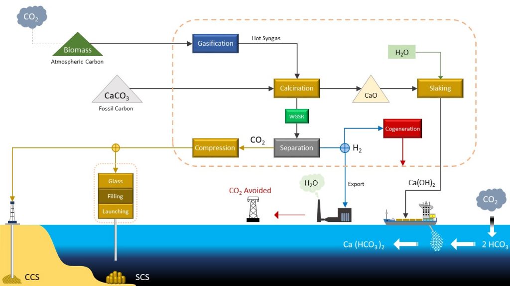 Il nostro processo combina tecnologie già utilizzate – come la gassificazione delle biomasse, la calcinazione del calcare o la produzione dell’idrogeno dal syngas – con soluzioni che sono invece ancora in fase di ricerca sviluppo. Si tratta in particolare di tecnologie per lo stoccaggio della CO2 e per l’alcalinizzazione degli oceani.