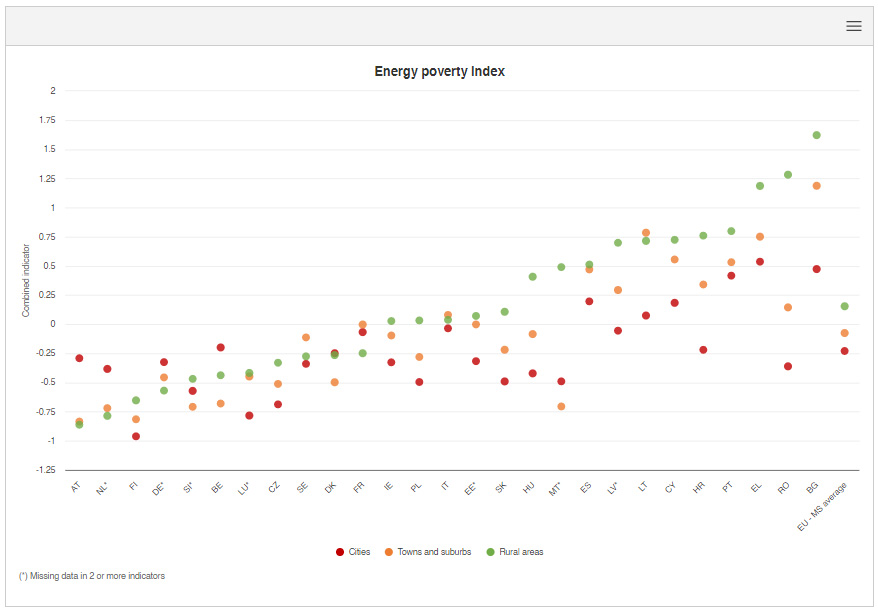 I risultati mostrano che le aree rurali registrano livelli più elevati di povertà energetica, soprattutto in Bulgaria, Romania e Grecia. Nei Paesi in cui i livelli di povertà energetica sono ben al di sopra della media UE, le aree rurali sono solitamente le più colpite, mentre le città sono sempre le meno colpite. La percentuale più alta di abitazioni con tetti che perdono e umidità si riscontra a Cipro e in Portogallo, così come nelle aree rurali di Ungheria, Spagna, Lettonia e Italia (21% o più).