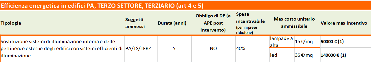 Ma con specifici limiti, infatti nell’ “Allegato I – 2. Criteri di ammissibilità per interventi di piccole dimensioni di incremento dell’efficienza energetica di cui all’articolo 5”, stabilisce: