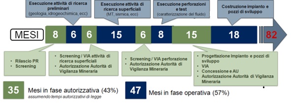 Dalla presentazione dell’istanza di permesso di ricerca alla produzione trascorrono oltre 6 – 8 anni. E’ infatti necessario superare diversi step autorizzativi consecutivi (valutazione di impatto ambientale (V.I.A.) delle attività di ricerca, V.I.A. dei pozzi esplorativi, istanza unica di concessione di coltivazione, autorizzazione unica e V.I.A.) che allungano notevolmente i tempi per il rilascio dell’autorizzazione definitiva, come schematicamente mostrato nella figura sotto riportata.