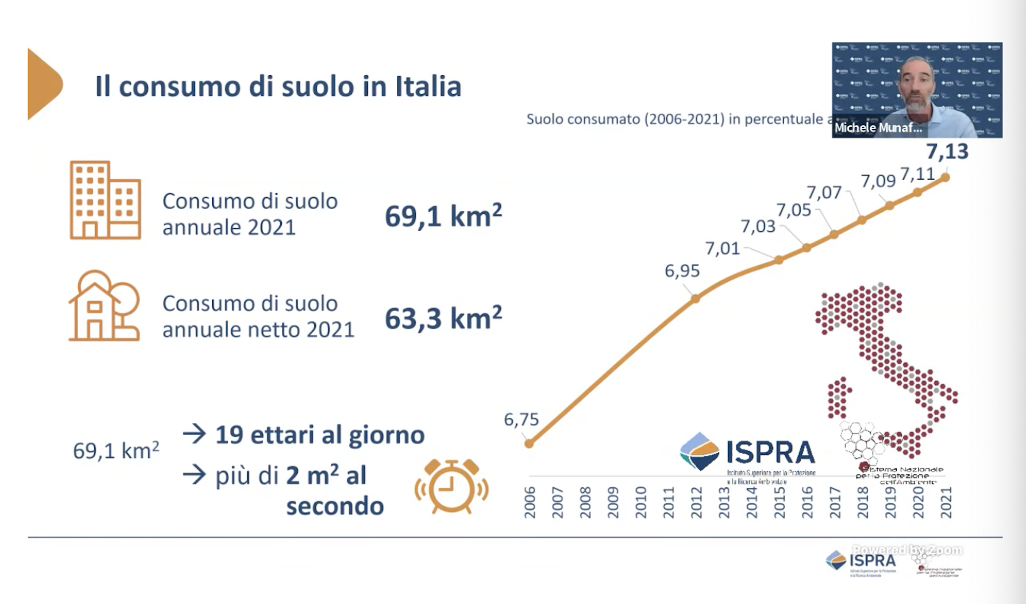 “In secondo luogo, prosegue, sulla logistica non dobbiamo stupirci, perché dobbiamo compiere uno shift modale dal trasporto su gomma verso altre modalità, come gli interporti e l’interfaccia tra gomma e ferro, siamo ancora indietro nel settore. Bisogna creare collegamenti ferroviari per ridurre l’impatto di suolo. A causa di questa crisi di Governo, si blocca l’iter della legge sulla rigenerazione urbana e questo è un enorme peccato, nove mesi intensi di lavoro ci avrebbero consentito di dare a questo Paese una legge sul tema. I progetti del PinQua sulla qualità dell’abitare, a cui abbiamo aggiunto altri due miliardi, dimostrano come il Paese sia pronto a dedicarsi alla rigenerazione urbana. Mi auguro che le mappe e i dati elaborati da Ispra diventino una base informativa indispensabile per farne un uso molto maggiore grazie alla qualità del Rapporto”.