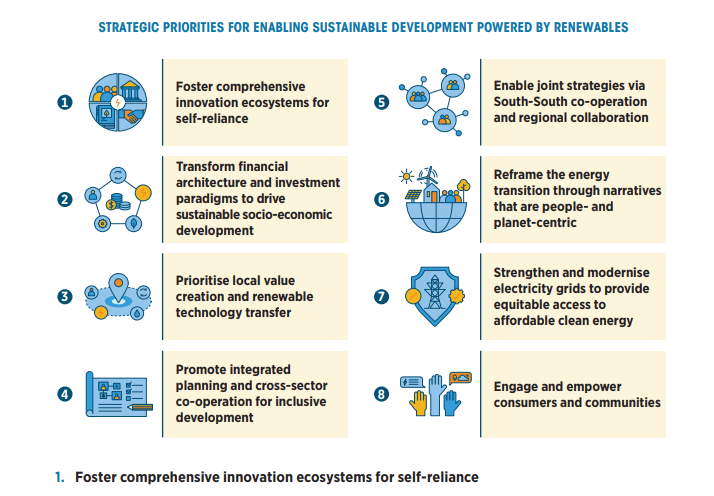 Irena individua otto priorità strategiche per creare un ambiente favorevole alle energie rinnovabili che promuove la crescita economica, sostiene la sicurezza energetica e guida una giusta transizione energetica. Le azioni prioritarie raccomandate mirano a sostenere l’adozione delle innovazioni esaminate in questo rapporto, consentendo al tempo stesso ai decisori politici di raggiungere molteplici obiettivi facilitando innovazione nei sistemi energetici alimentati da fonti rinnovabili.
