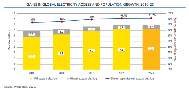La popolazione mondiale con accesso all’elettricità è aumentata a circa il 92%, ma 666 milioni di persone non dispongono ancora di un accesso di base: ciò indica che il tasso attuale è insufficiente per raggiungere l’accesso universale entro il 2030. L’accesso a una cucina pulita ha registrato solo un miglioramento limitato, poiché i progressi sono stati superati dalla crescita demografica, lasciando 2,1 miliardi di persone dipendenti da combustibili e tecnologie inquinanti. Lo evidenzia il rapporto Tracking Sdg 7: The Energy Progress Report 2025 realizzato congiuntamente da Irena in collaborazione con l’Agenzia Internazionale per l’Energia (Aie), la Divisione di Statistica delle Nazioni Unite (Unsd), la Banca Mondiale e l’Organizzazione Mondiale della Sanità (Oms).