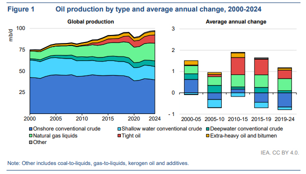 - Petrolio convenzionale: la produzione dai giacimenti convenzionali è scesa dal 97% del totale nel 2000 al 77% nel 2024, a causa della crescita delle fonti non convenzionali.