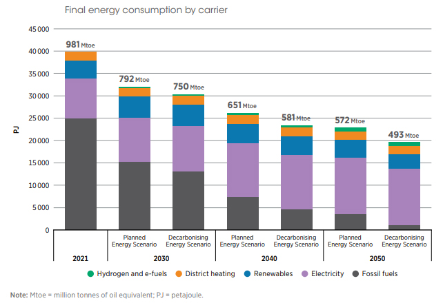 La quota di energie rinnovabili nel consumo finale di energia per l’UE27 salirà dal 22% nel 2021 al 39% e al 43% nel 2030, al 54% e al 67% nel 2040 e al 65% e all’81% nel 2050, rispettivamente nello scenario energetico pianificato (PES) e nello scenario energetico di decarbonizzazione (DES). Tutti i Paesi vedranno aumentare la propria quota di energie rinnovabili nel tempo: del 20-60% entro il 2030 e del 55-95% entro il 2050. Nel 2021, i primi cinque consumatori erano Germania, Francia, Italia, Spagna e Polonia: secondo l’analisi, si prevede che continueranno a esserlo anche nel 2050, rappresentando il 75% del consumo energetico finale dell’UE27. Si prevede che questi cinque Paesi ridurranno la loro intensità energetica durante il periodo di studio, con l’aumento del loro Pil pro capite: