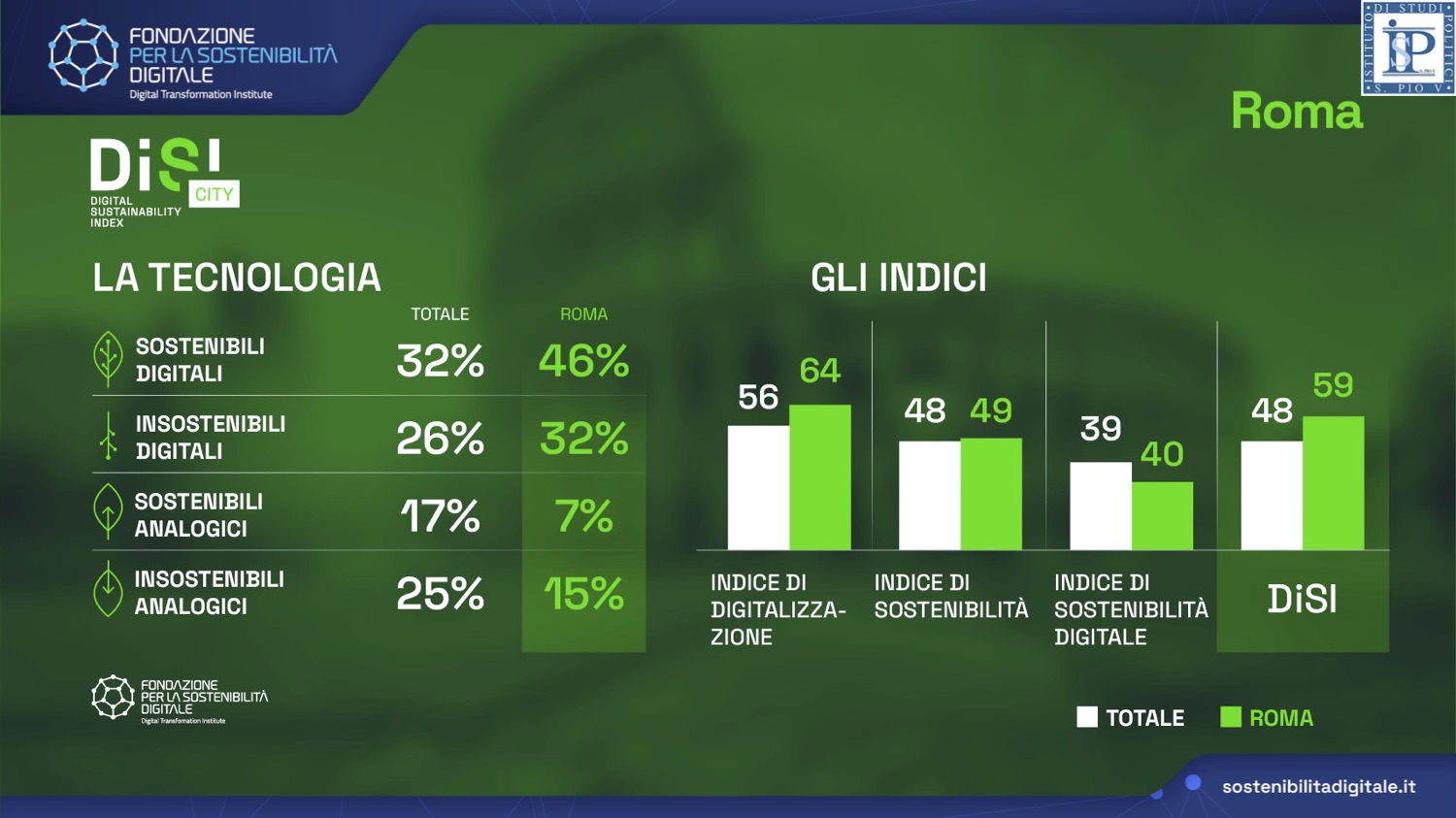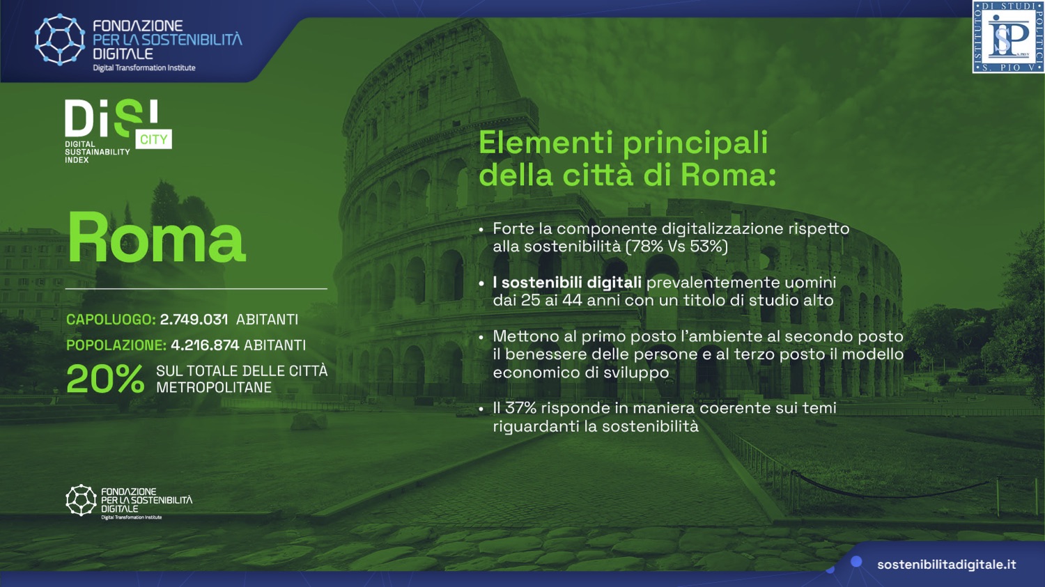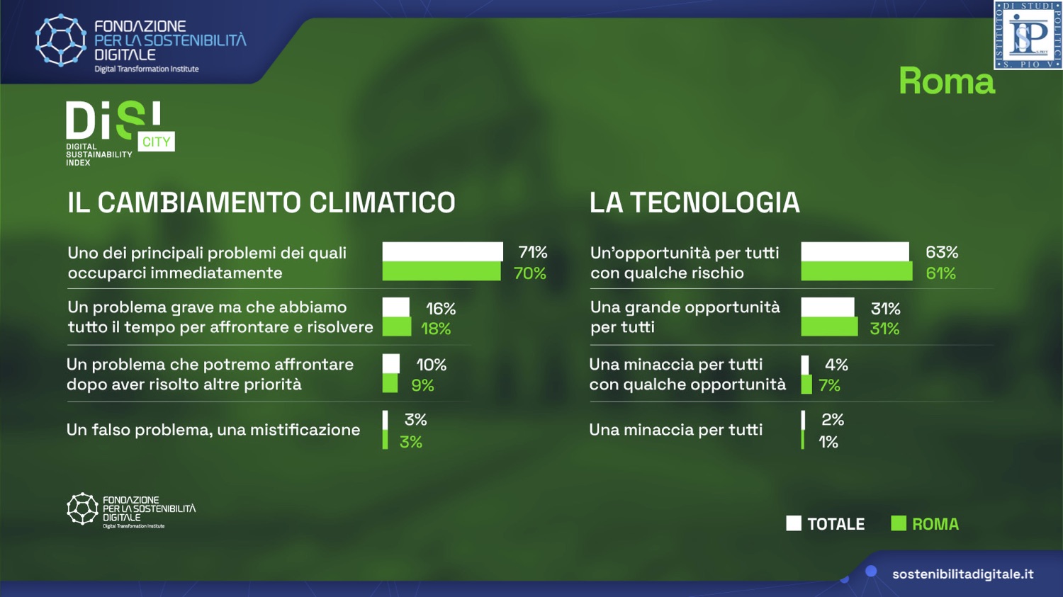 Esaminando i dati relativi alla capitale, si evince come i romani siano, in generale, molto più attenti alla digitalizzazione che alla sostenibilità. Il 78 per cento dei cittadini fa uso di infrastrutture e servizi digitali, ma solo il 53 per cento è fortemente sensibile ai temi della sostenibilità. I più attenti sono gli uomini di età compresa fra i 25 e i 44 anni, con un titolo di studio elevato. Fra le varie priorità, mettono al primo posto l’ambiente, seguito dal benessere delle persone e dal modello economico di sviluppo.