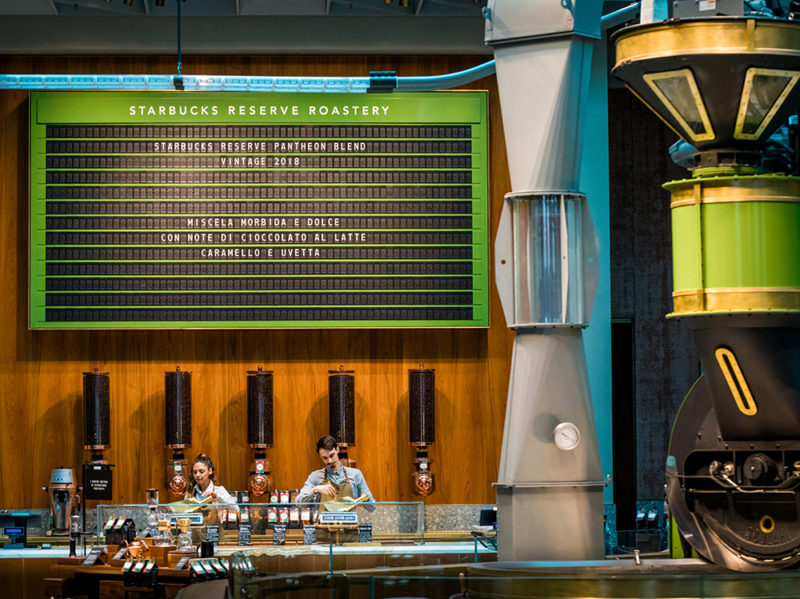 Starbucks, la famosa catena americana del caffè, è sbarcata in Italia con il suo primo negozio in piazza Cordusio, nel pieno centro di Milano. Il locale, aperto al pubblico dal 7 settembre, sfrutta un nuovo format, il Reserve Roastery, e utilizza il display a palette progettato e prodotto dall’azienda italiana Solari Udine. Si tratta di quei display che vengono impiegati nelle stazioni o negli aeroporti per segnalare orari e partenze.